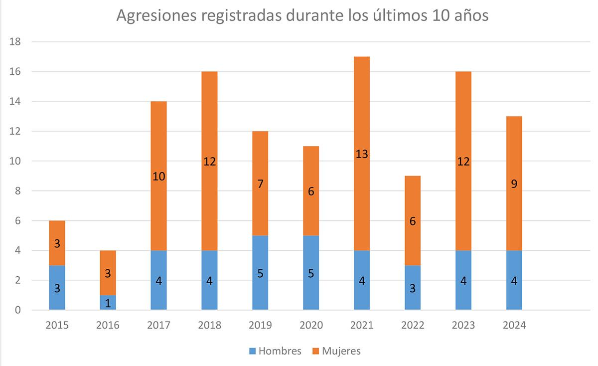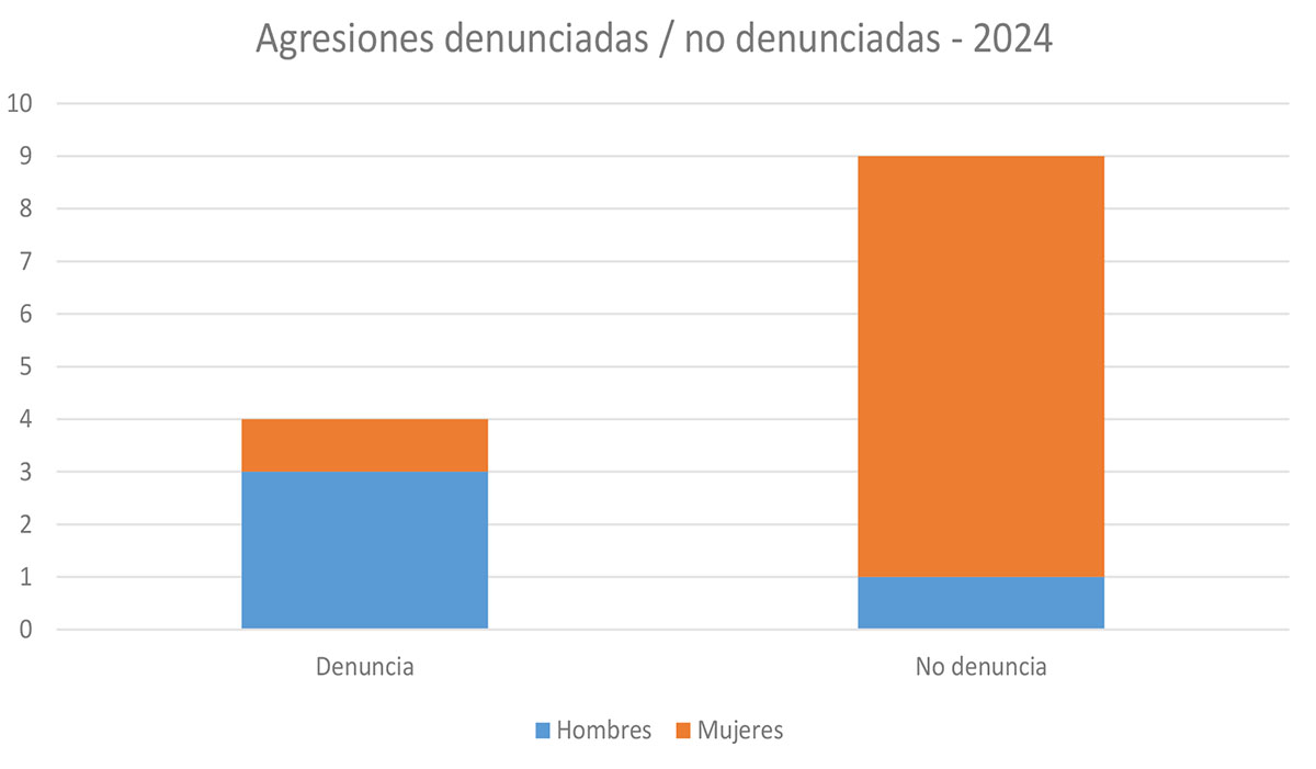 En el año 2024 se registró un descenso de casi un 19% en las agresiones comunicadas al Colegio con respecto al año anterior, pasando de las 16 registradas en 2023 a las 13 agresiones comunicadas en 2024.