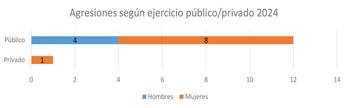 Con respecto a las 13 comunicaciones de agresión formuladas en el presente año, 12 se han realizado por médicos/as con ejercicio en SAS o administraciones públicas, y solo 1 por médicos/as en ejercicio privado. Así, las agresiones a médicos que trabajan en el ejercicio público significaron el 92,30% del total.