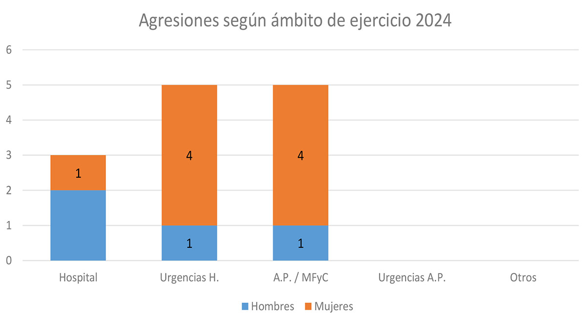 Con respecto al ámbito de ejercicio, el 23,08% de las agresiones comunicadas se registraron en el ámbito Hospitalario (no Urgencias); el 38,46% lo fueron en el ámbito de las Urgencias Hospitalarias; las correspondientes a la Atención Primaria / Medicina Familiar y Comunitaria registraron igualmente el 38,46% de las agresiones comunicadas; y no se registraron agresiones comunicadas en el ámbito de las Urgencias Extrahospitalarias; como tampoco se registraron agresiones comunicadas en otros ámbitos distintos a los mencionados.