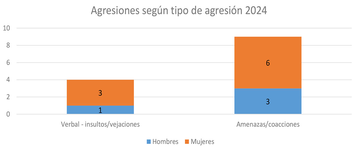De las 13 agresiones comunicadas, 4 lo fueron por insultos o violencia verbal/vejaciones; y en 9 casos más se llegó a la amenaza. Afortunadamente, no se comunicaron casos de agresiones físicas.