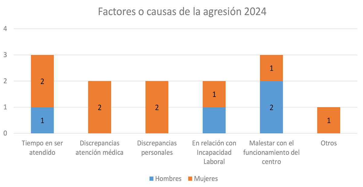 Con respecto a los factores o causas relacionadas con la agresión, se registraron los siguientes datos: en 3 casos por el tiempo en ser atendido; en 2 casos por discrepancias con la atención médica; en otros 2 casos por discrepancias personales; en 2 casos en relación con la incapacidad laboral; en 3 casos por malestar con el funcionamiento del centro sanitario; y en 1 caso por otras causas.