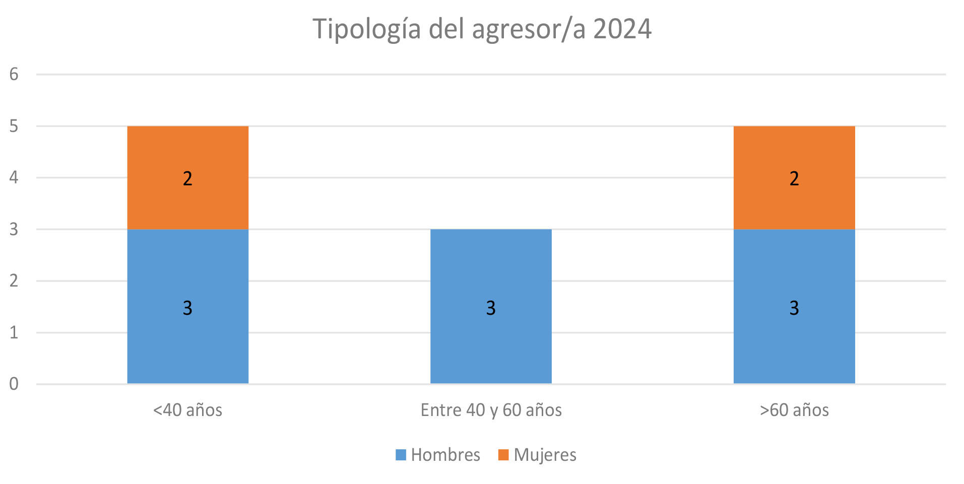 Con respecto a la tipología del agresor/a, y frente a datos de años anteriores, este año se puede establecer una diferencia muy acusada por género (9 varones, 4 mujeres) pero no por tramos de edad (5 de menos de 40 años; 3 entre 40 y 60 años; y 5 de más de 60 años).