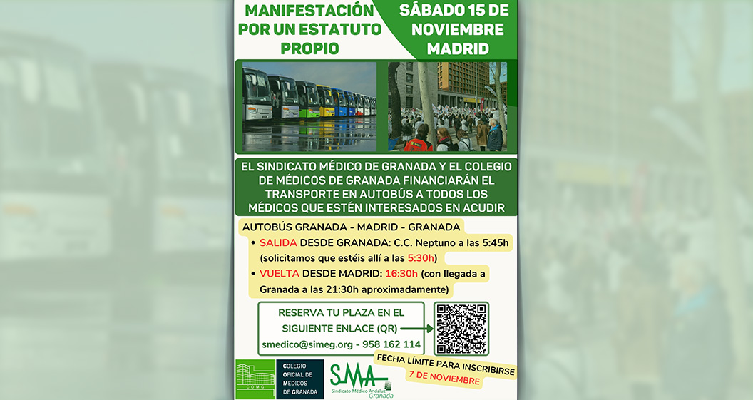 El próximo 15 de noviembre de 2025 (sábado), se celebrará en Madrid una manifestación contra el estatuto marco bajo el lema "Por un Estatuto Propio de la Profesión Médica y Facultativa". El Colegio de Médicos de Granada y el Sindicato Médico de Granada se suman a esta protesta y ponemos a disposición de los colegiados […]