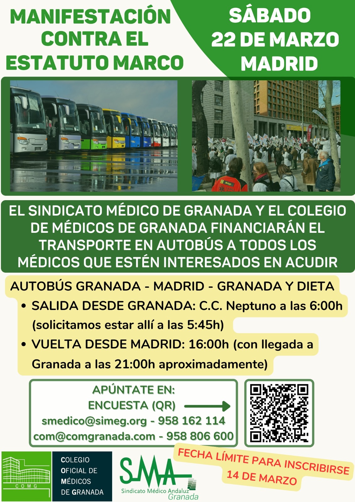 El Colegio de Médicos de Granada y el Sindicato Médico de Granada se suman a esta protesta y ponemos a disposición de los colegiados autobuses para el desplazamiento a Madrid.